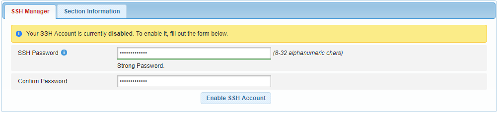 Password: Your SSH password (the password you submitted, when you created your SSH account)