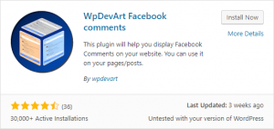 Search for the WpDevArt Facebook comments plugin. Click on Install Now. Wait for the plugin to install, and click the Activate button.