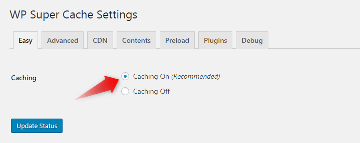 - Once activated, go to the WP Super Cache settings page and select the Caching On option.